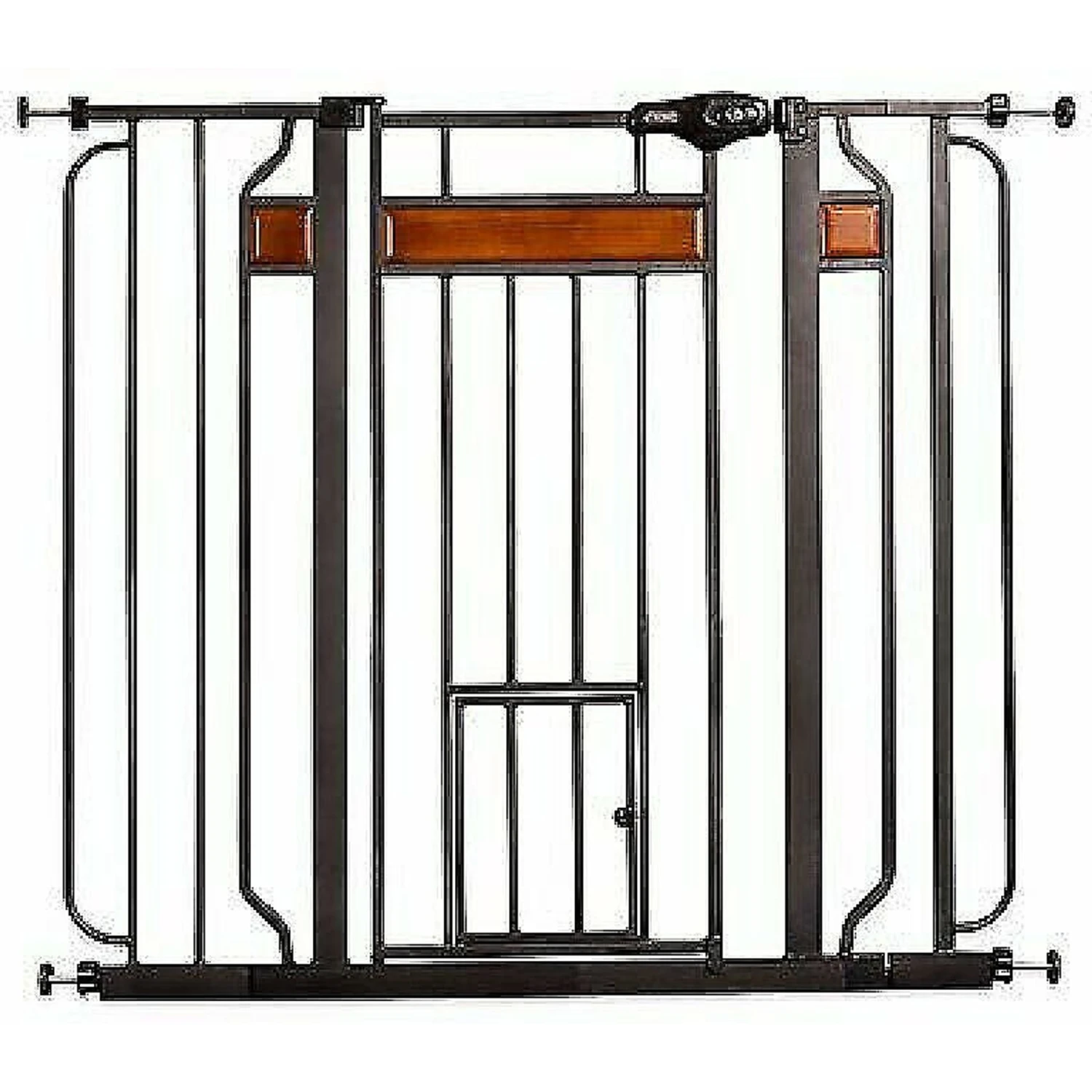 - Chew-proof gate features all-steel construction with elegant cherry wood accents.