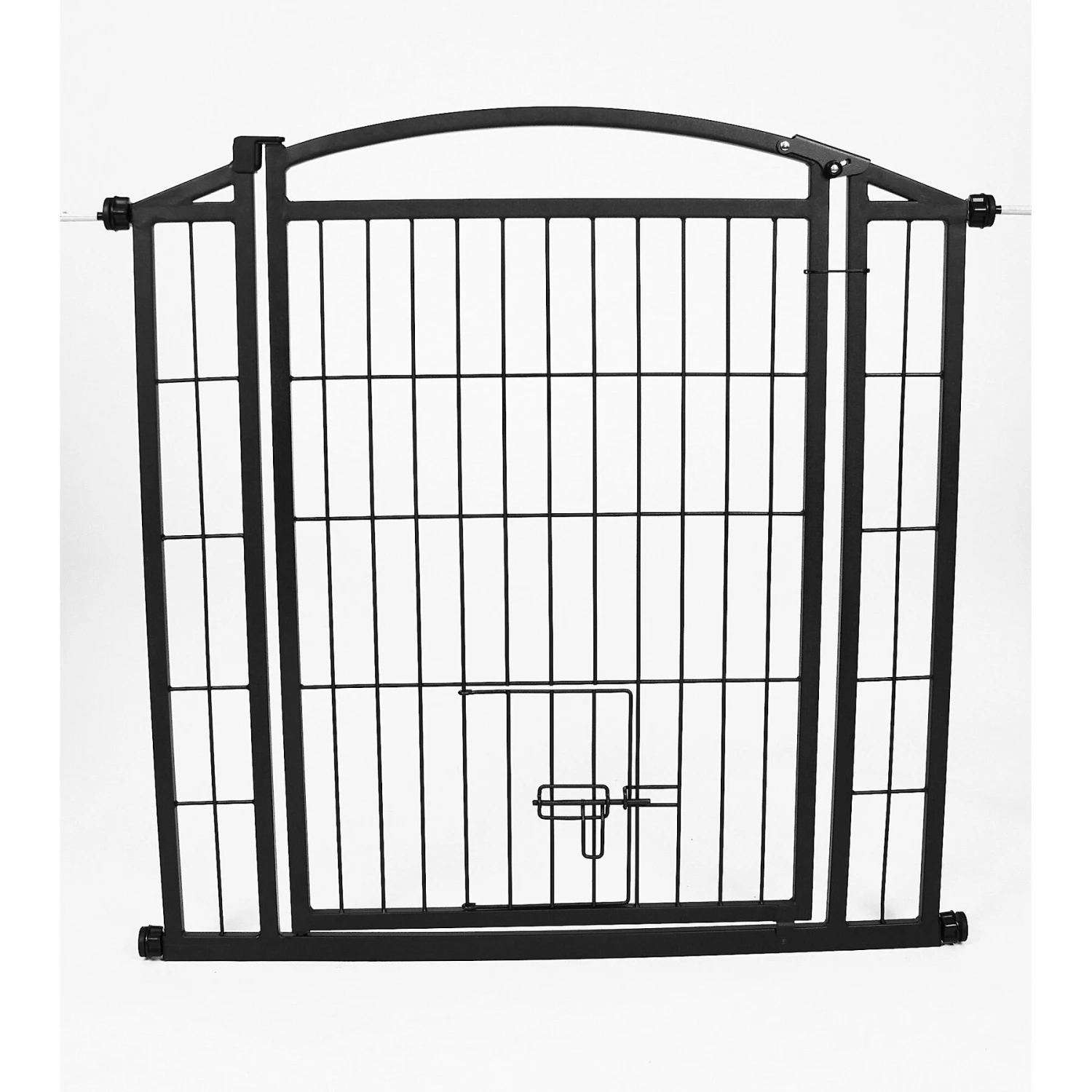 Keep porch pooches safe and happy with the Carlson Pet Products Weatherproof Outdoor Walk-Thru Pet Gate, Black. This sturdy, weatherproof gate works great for securing pups on outdoor porches. The all-steel gate fits in any opening from 29-42 inches wide with the easy-install no-damage pressure mounts. It features a convenient walk-through design with a double lock lever handle and a 10 X 7-inch door for smaller animals. Mount it at the top or bottom of the porch stairs or even in your front doorway so your canine can catch a breeze!