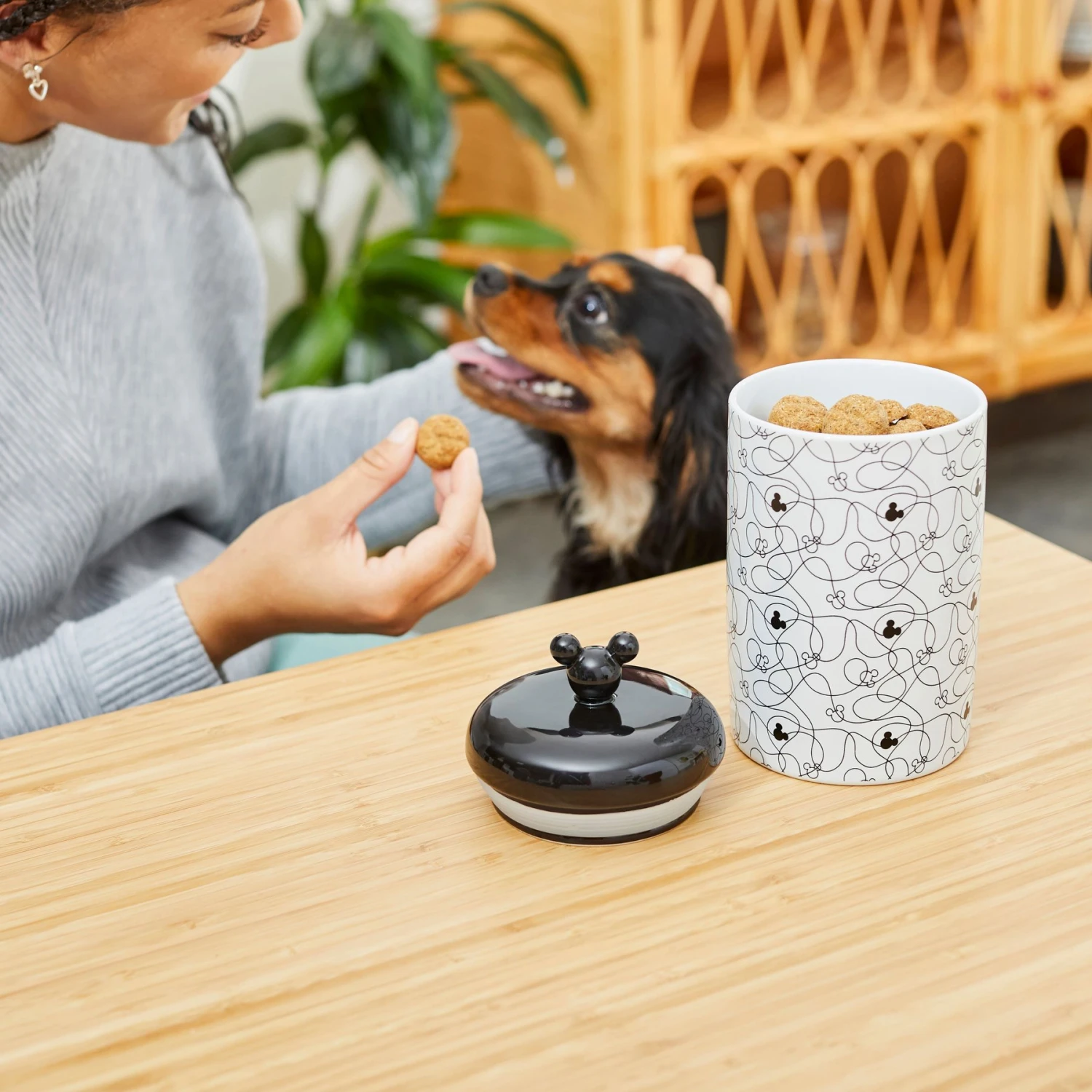 Disney Mickey Lines Ceramic Treat Jar, 3.75 Cups—Keep your furry superfan’s treats fresh and tasty with the Disney Mickey Mouse Lines Ceramic Treat Jar! It holds up to 3.75 cups of your pet’s favorite treats, whether they’re a purring pal or canine companion, and features a cool, modern design with black-and-white linework and Mickey Mouse silhouettes. Plus, it matches the Disney Mickey Lines Non-Skid Ceramic dog and cat bowls!