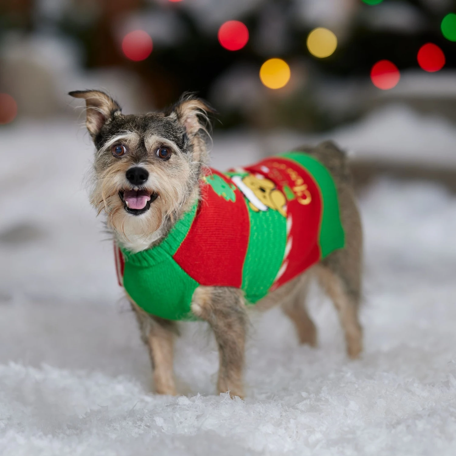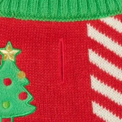 - Disney’s Winnie the Pooh sweater is designed in green-and-red knit patchwork with Christmas tree and ornament decorative accents.
