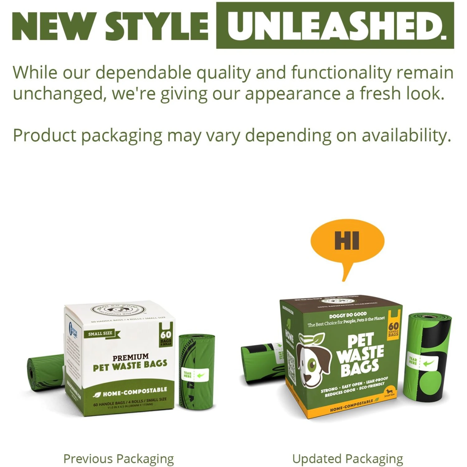 Pick up after your furry friend with Doggy Do Good Certified Compostable Premium Dog & Cat Waste Bags, Small Handle Bags – On Rolls! These scent-free, tear-free, leak-proof small waste bags are thick (20 microns thick) and tough, keeping the contents and unpleasant odors inside the bag where they belong. They are 38% vegetable based and made from corn starch, an annually renewable source, along with other bio-based proprietary components. Since these waste bags are soft to the touch, they don’t stick to each other, which makes them paws-itively easy to open. And since they are scent-free they won’t bother pet parents who are sensitive to fragrances! These small bags measure 4.5 in. x 11.0 in. (folded) / 8.5 in. x 11.0 in with gusset expanded, making them a paw-fect option for small dogs, toy breeds and puppies. The gusseted side panels expand for maximum capacity! There are 15 bags per roll and the core of each roll is made from recycled materials. These rolls fit in any standard-sized poop bag dispenser. And you can feel extra good knowing that Doggy Do Good does good for the environment because they are part of a group of organizations that pledge a minimum of 1% of annual sales to environmental causes. Doggy Do Good donates an additional portion of proceeds to rescues and animal welfare organizations, too!