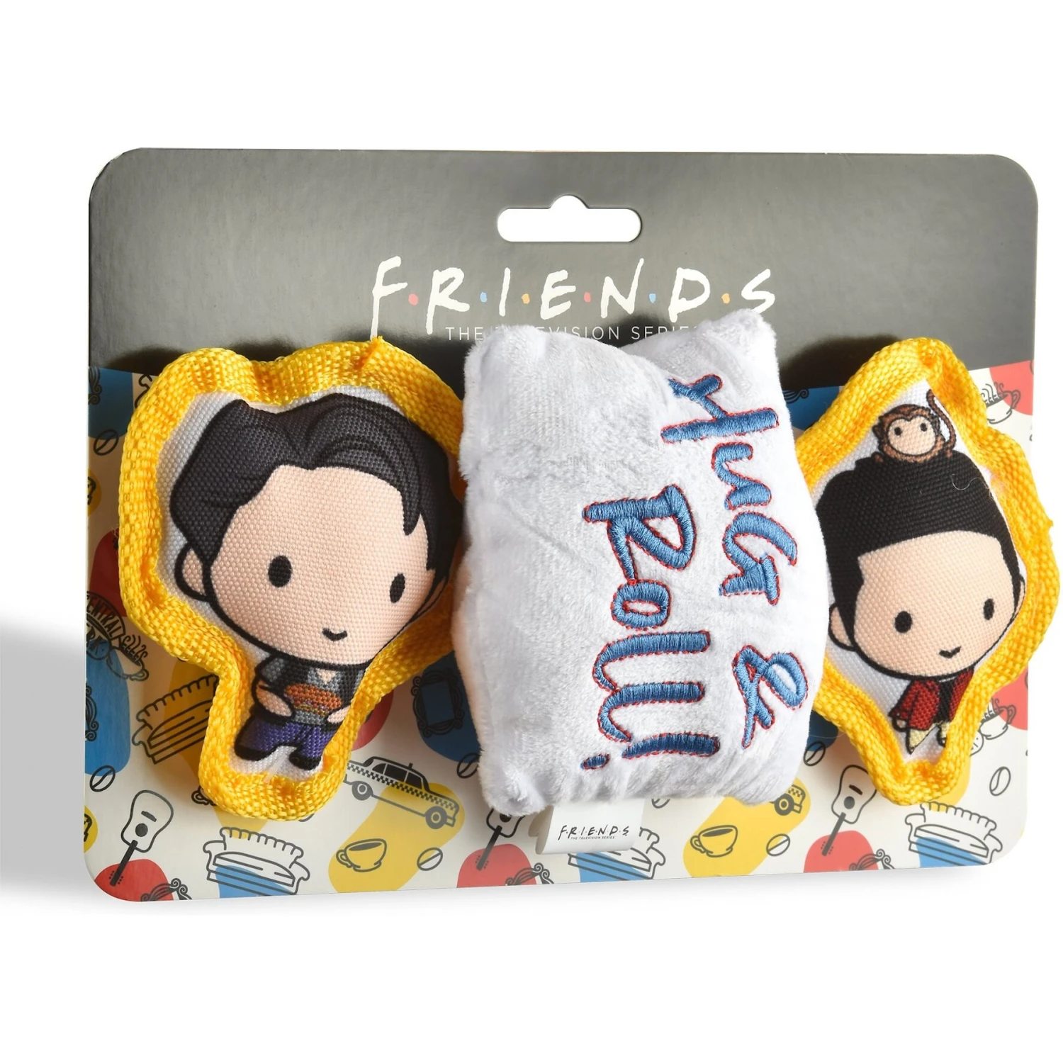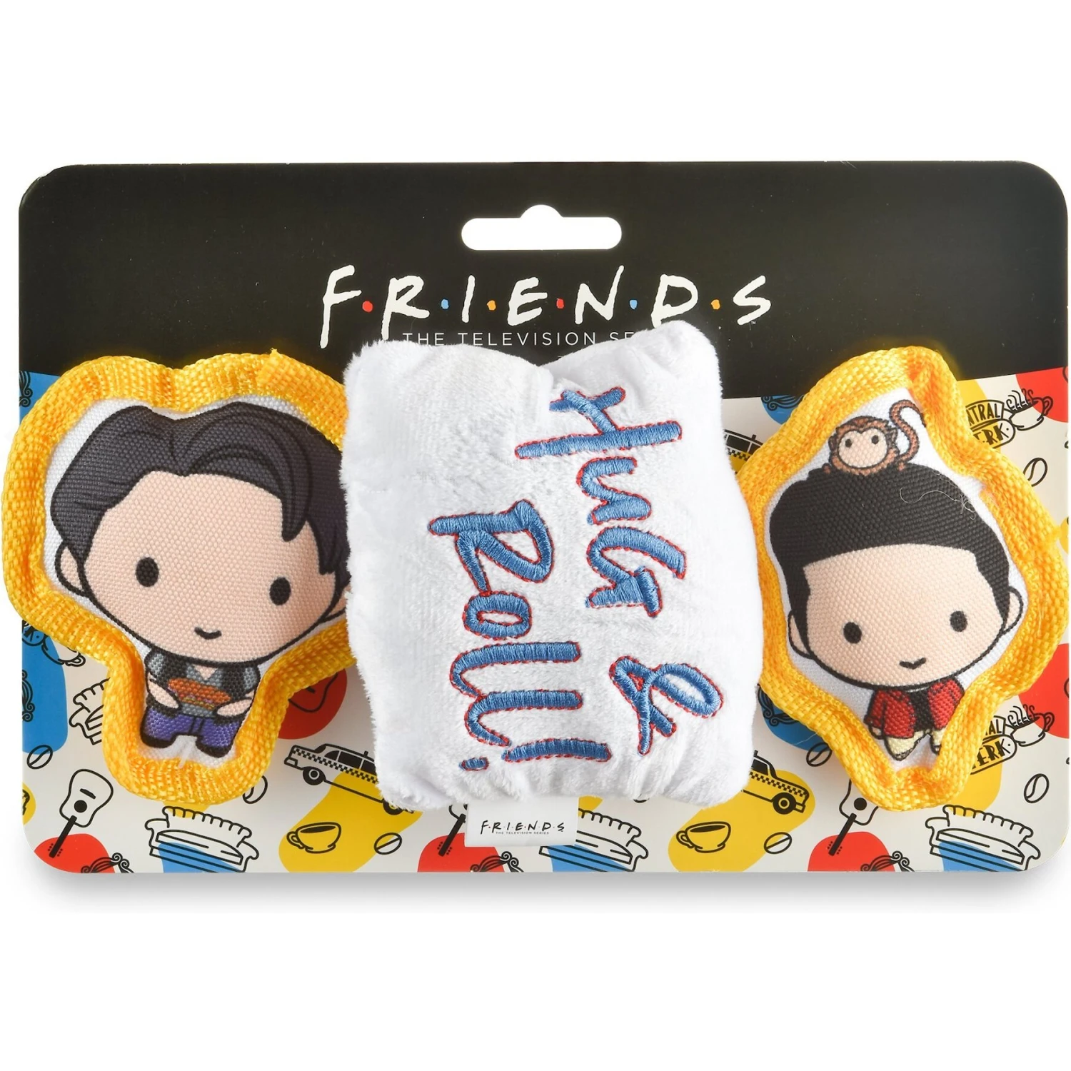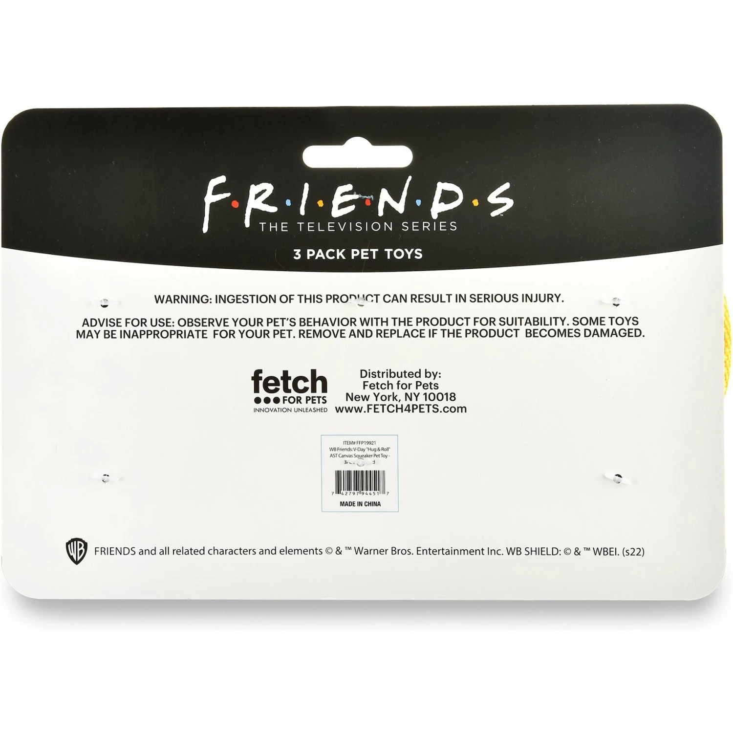 Share your love of the iconic series “Friends” with your own furry friend when you bring home this Fetch For Pets Friends V-Day “Hug & Roll” Canvas Squeaky Dog Toy set. This whimsical set includes 3 canvas toys–Ross, Chandler, and a pillow that proclaims, “Hug & Roll.” Settle in for a marathon of your favorite episodes while your best bud fetches, tosses, carries, and chews on their new toys.