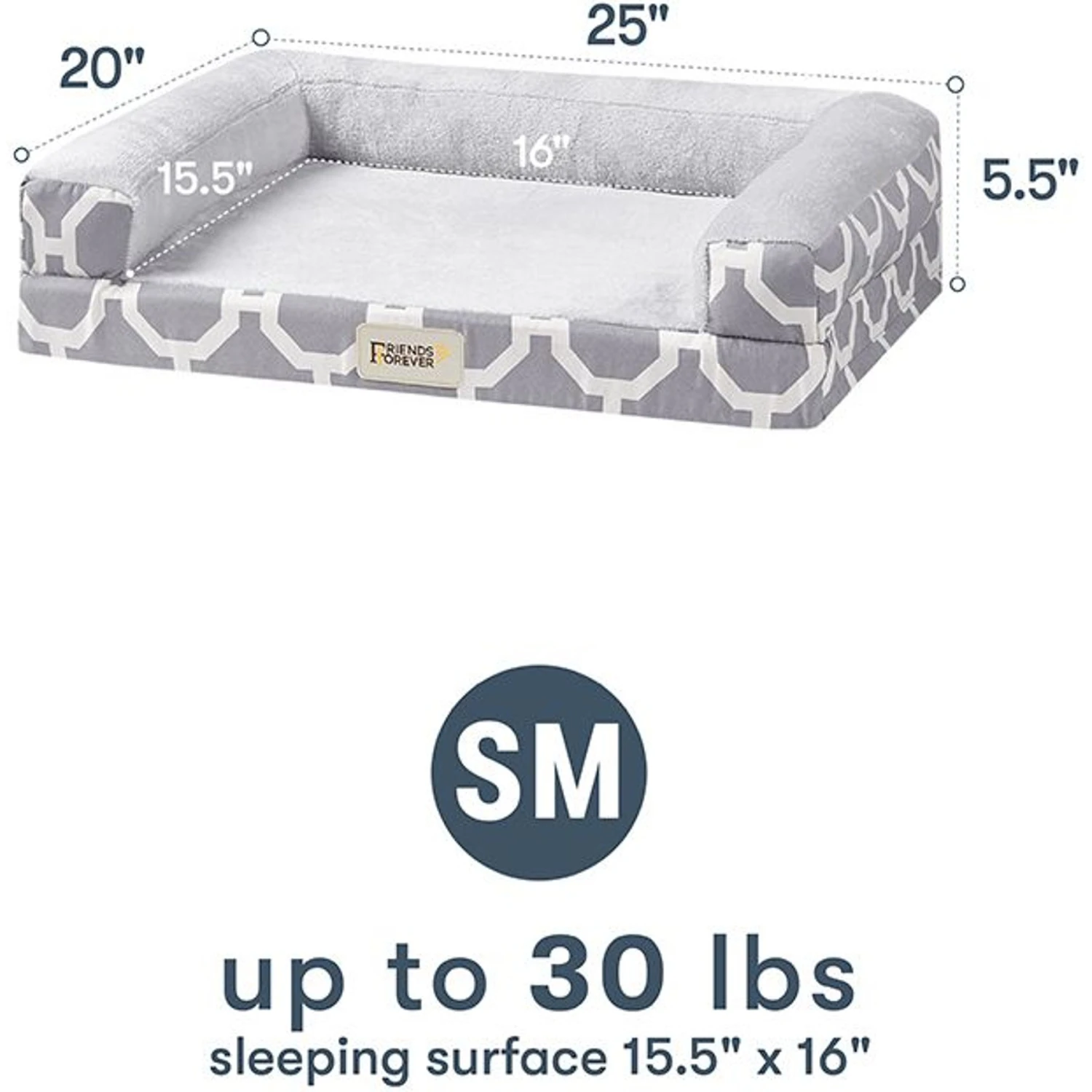Keep your furry friend comfy and happy with the Friends Forever Harper Orthopedic Couch Bolster Sofa with Removable Cover Cat & Dog Bed! Designed with extra care, your best pal will get a solid night’s sleep in this luxuriously comfortable bed. The cushioned bolster features an orthopedic foam base, providing exceptional comfort for head, hip and bone support—paw-fect for your fur-iend with joint pain or arthritis. The low entrance allows your smaller or older pet easy access, and the cover removes easily for machine cold-water washing, drying and reshaping. You’ll love the fashionable fabric design that matches your home décor.