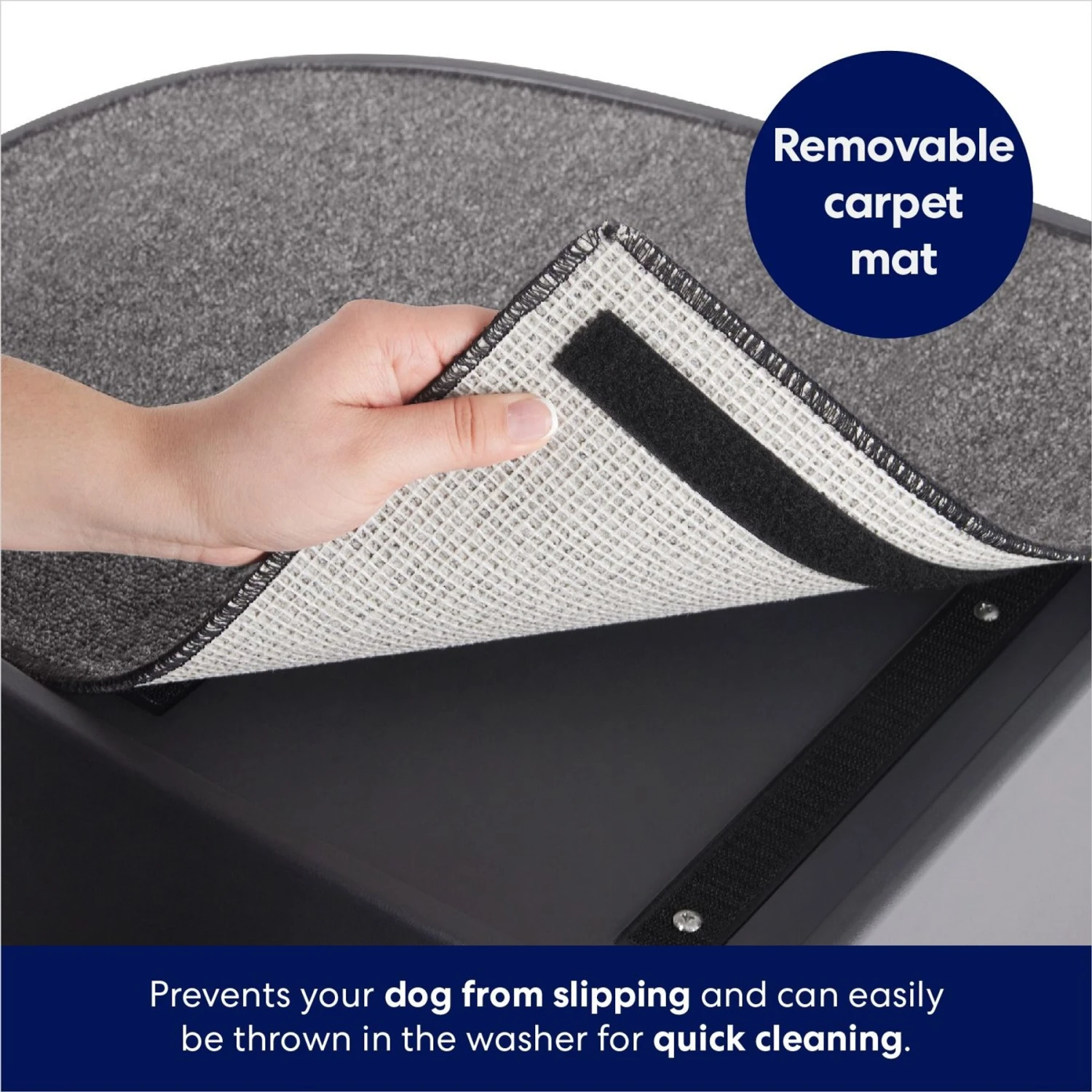 - The step platform features a fully carpeted surface that’s removable and machine washable, so keeping it clean is as easy as adding it to the laundry load.