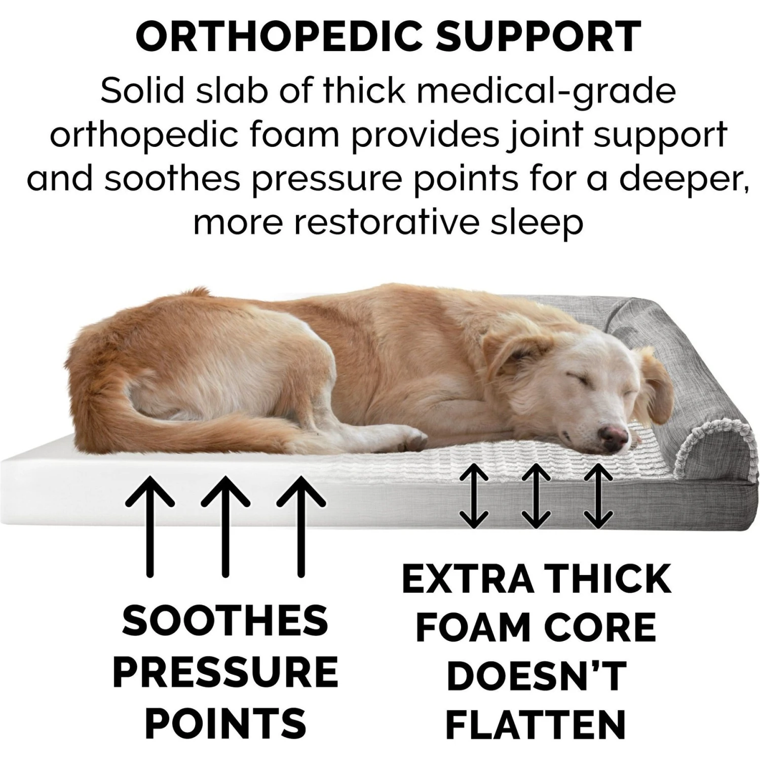 Paw-fect for cats and dogs of all ages, the FurHaven Luxe Fur & Performance Linen Full Support Sofa Pet Bed is a short-sided pet sofa that’s sure to become your pet’s favorite snuggle spot. Soft sided walls provide bolstered support on both edges and the back of the bed, allowing your pet to relax into comfort with their back, hips and head supported. The solid orthopedic foam base supports your furbaby’s joints and pressure points, making this bed ideal for arthritic pets who have trouble getting comfortable. Plus, the full-support, solid slab orthopedic foam provides even more support and comfort. Give your furry companion the luxury they deserve with this orthopedic dog bed. Each bolster is filled with 100% recycled fluffy fill. The sofa’s gusset and bolsters are covered in easy-care fabrics with the look and feel of linen plus a plush faux fur sleep surface that’s oh-so-soft on noses and paws. Best of all, the cover is easily removed and machine washable for your convenience!