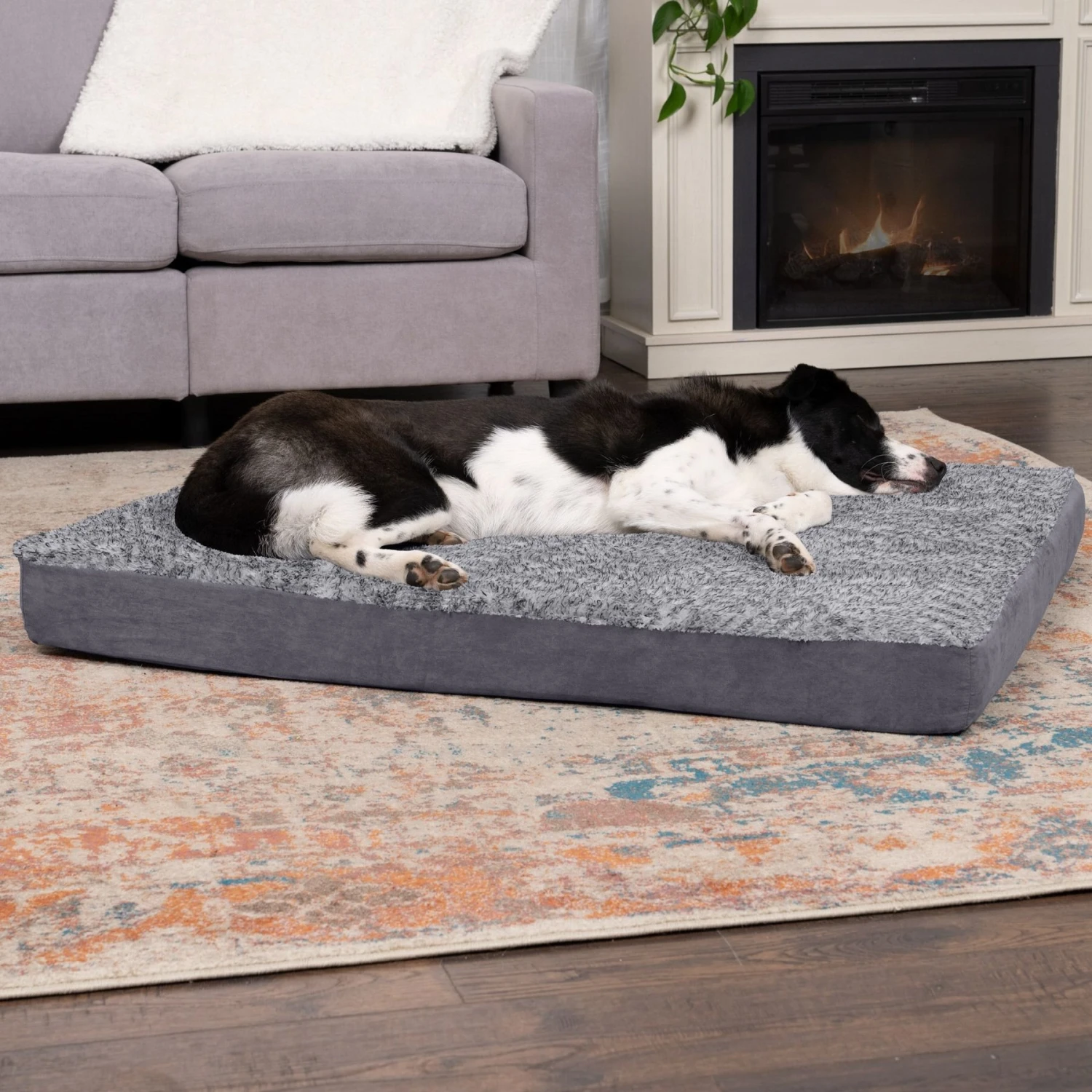 Give your best friend the support they need with a luxuriously soft FurHaven Two-Tone Faux Fur & Suede Deluxe Orthopedic Mat pet bed. Solid orthopedic foam provides your pet with extra support and cushioning for maximum comfort. This full support solid slab orthopedic foam provides even more support and comfort. Your pet will benefit from the orthopedic foam which is designed to evenly distribute weight and alleviate painful pressure on muscles and joints. Better rest for your pet can lead to improved overall health. Easy step-on mat design for smaller, older or disabled pets. The cover is zippered and removable for easy machine-washing, while the foam core is hand wash. This pet bed is ideal for bigger dogs (or smaller dogs to share) who like to sprawl & snooze the day away.