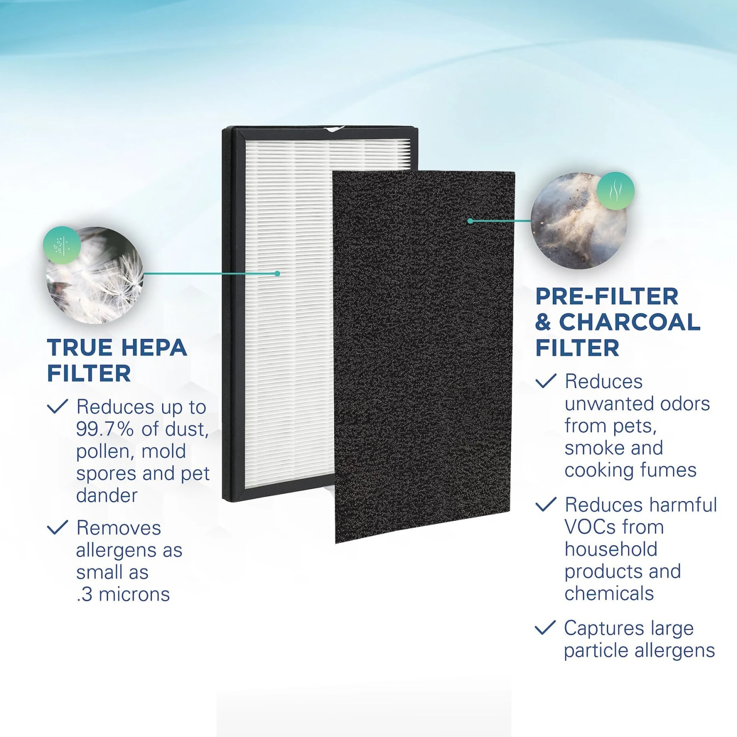 - Activated charcoal filter helps reduce household odors—also acts as a pre-filter to trap allergens like pet hair and other large particles.