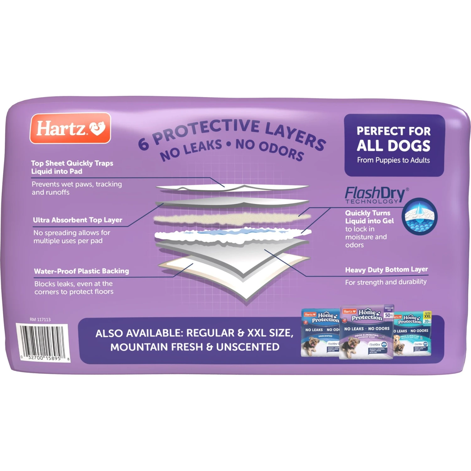 Take the pee-ew! out of indoor potty breaks with Hartz Home Protection No Odor No Leaks Lavendar Scented 3X-Large Dog Pads These pads feature FlashDry technology—instantly turning liquid into gel to keep your floor dry and protect it from damaging leaks and overflow. These pads don’t simply mask odors but work to eliminate them with a light lavender scent that helps you maintain a clean-smelling home.