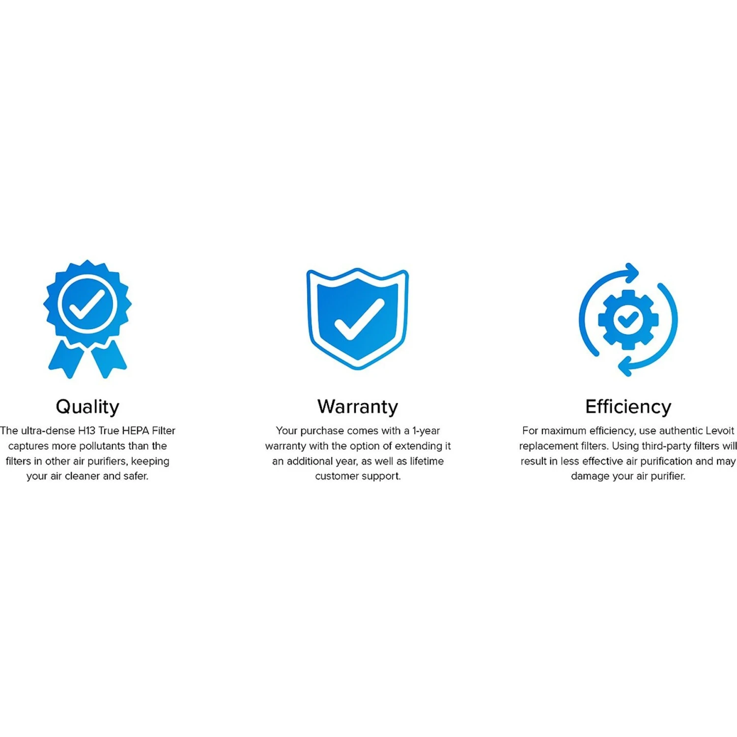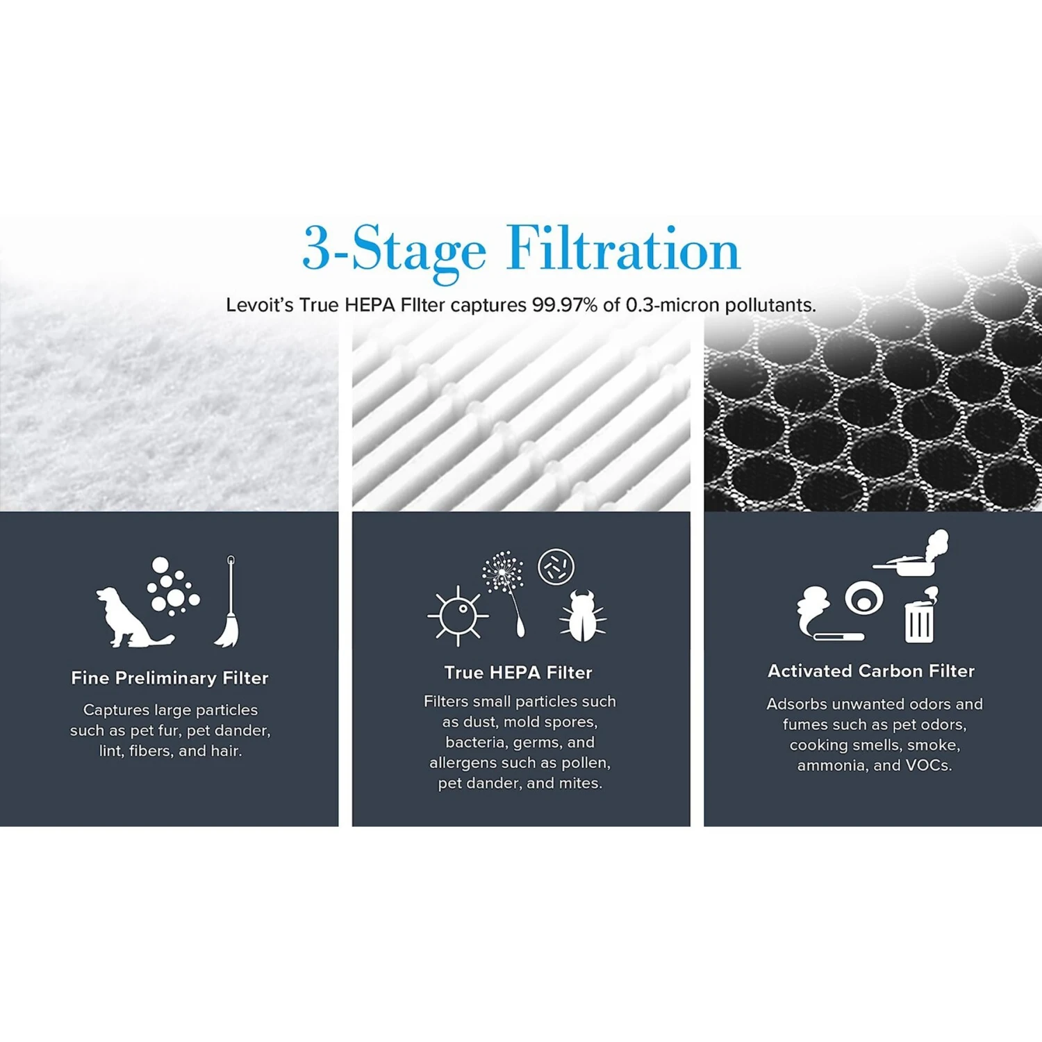 The LEVOIT True HEPA Air Purifier Replacement Filter uses a 3-stage filtration system that captures at least 99.97% of airborne particles 0.3 microns in size. This helps fill your home with fresh, clean air that’s free of harmful contaminants. The 3-stage filtration includes a pre-filter, an H13 True HEPA Filter and a High-Efficiency Activated Carbon Filter. The High-Efficiency Activated Carbon Filter can trap a variety of odors, including smoke, fumes, VOCs, cooking smells, pet odors and cigarette smoke. This filter can be used as a replacement filter for the Levoit True HEPA Core 300 Air Purifier.