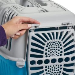- Features a secure plastic door that can open in either direction with a built-in carrying handle.