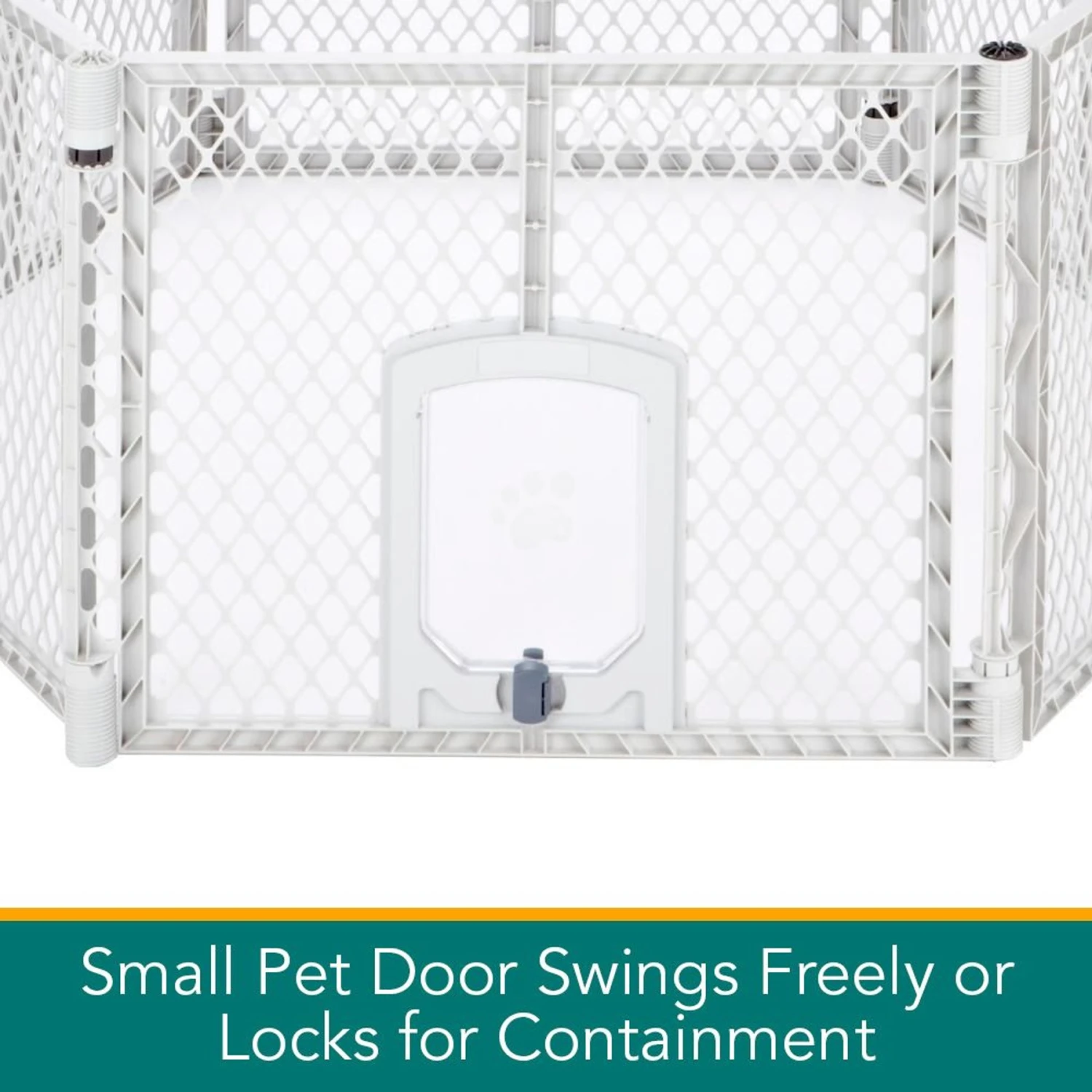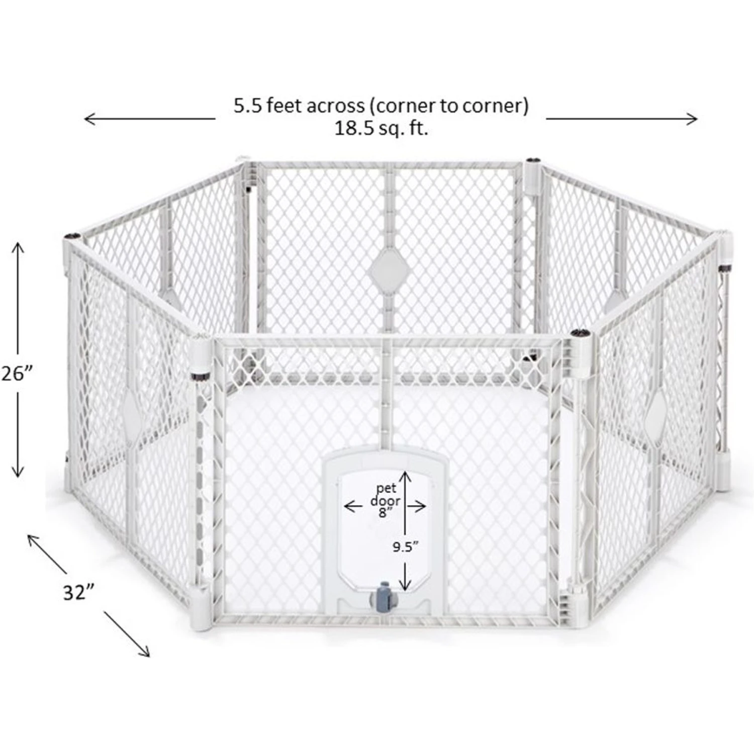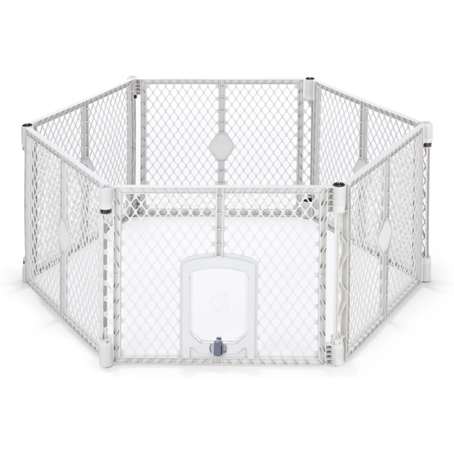 The Petyard Passage is a safe, portable containment area which features an exclusive swinging door for pets. The 9 ½” high by 8″ wide door swings freely allowing your pal the freedom to come and go as she pleases and it also locks offering you peace of mind. The Petyard Passage encloses up to 18.5 sq. ft. of space and is 26 inches high, which means it’s paw-sitively perfect for households with multiple pets. And increasing or reducing the size of your Petyard is easy, simply add or remove panels for multiple configurations for all stages and phases of your pet’s life. Adding a Two-Panel Extension (sold separately) will increase the size of your Petyard to 34.4 sq. ft. To make a cozy crate, simply remove two panels. The Petyard Passage folds up easily and comes complete with a carry strap. Weather-resistant and portable, the Petyard Passage can be used just about anywhere.