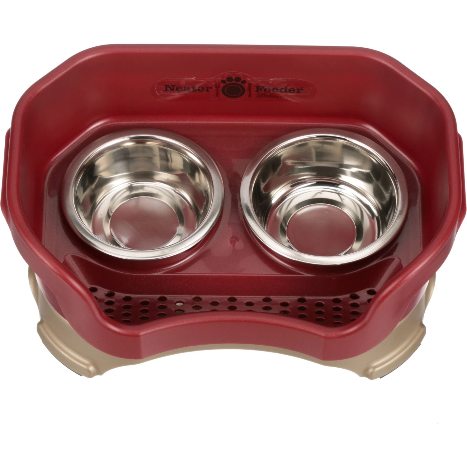 The Neater Feeder Deluxe from Neater Pets solves the problem of messy dogs spilling food and water on your floors. It’s designed with protective walls to contain splashes and spills from an inadvertent kick or an excited pet. The revolutionary system holds spilled food in an upper reservoir while spilled water flows down a gentle slope through a filtering system into a lower reservoir. The bottom container can safely hold more than an entire bowl of spilled water, keeping it off your floors until you are ready to dispose of it. Keeping the spilled food in the upper reservoir, off the floor, not only saves you work, but also keeps it clean for reuse. The Neater Feeder is also an elevated feeder. Using raised bowls helps improve digestions and reduces strain on your dog’s neck and joints, while also helping to keep ants and other pests out of her food. The Neater Feeder Deluxe comes in three sizes. The Small is ideal for small dogs (Chihuahua, Terriers), the Medium is for medium sized dogs (Cocker Spaniel, Beagle), and the Large is for large sized dogs (Golden Retriever, Labrador). Each comes with a food bowl and a water bowl sized for that dog. We always give you a larger water bowl since we want to make sure your dog never gets dehydrated! Make mealtime healthier and cleaner with the Neater Feeder!