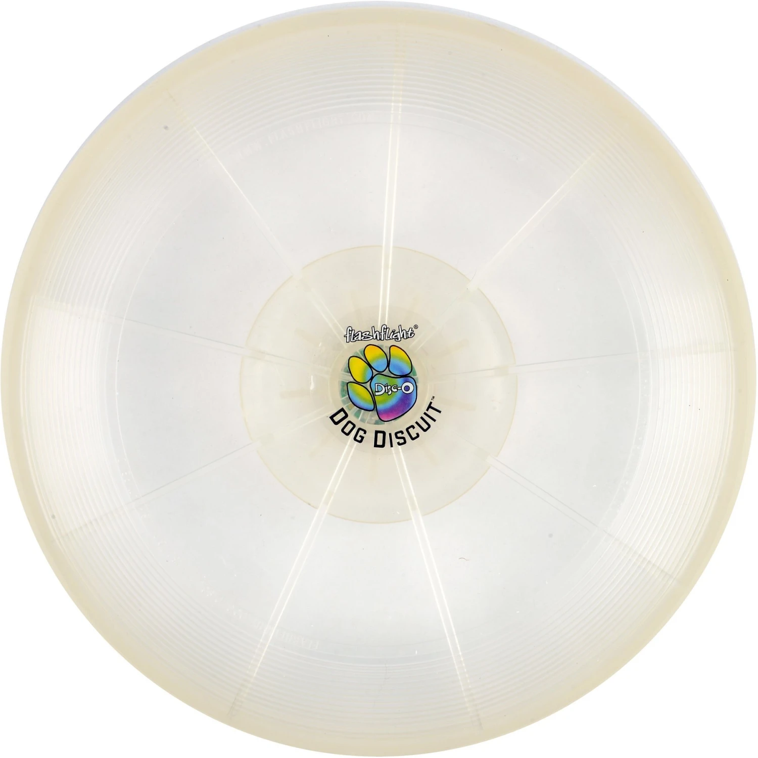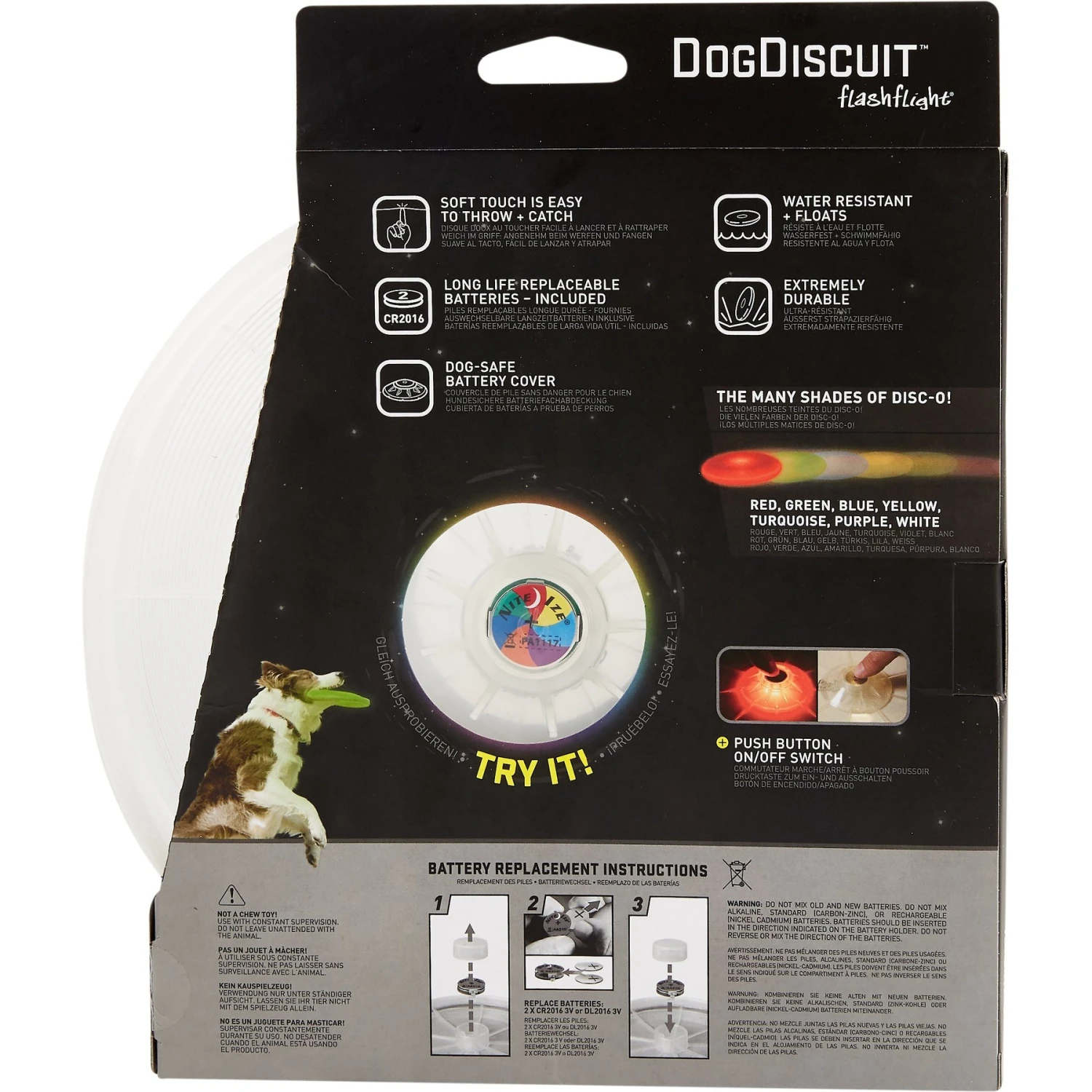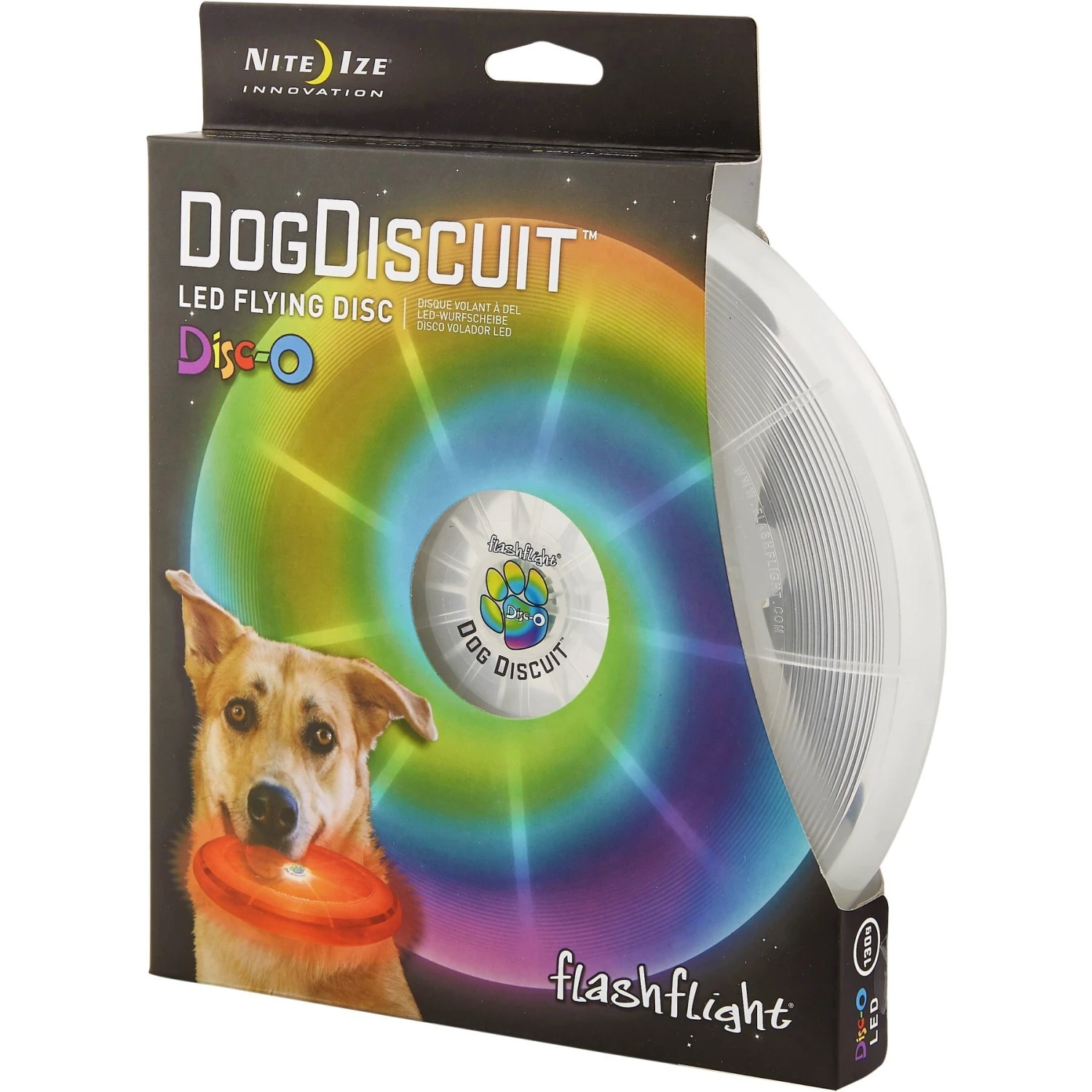 Designed for superior flight, the Nite Ize Flashflight Discuit LED Flying Disc Dog Toy is a soft-touch, plastic, flying disc made specifically for nighttime play with your disc-loving dog. It’s illuminated by a super-efficient, long-lasting LED, so it glows brightly in the dark. The Dog Discuit is not only super fun, it’s mouth friendly, bite durable, and has a canine-resistant cap that helps prevent dogs from chewing off the battery and LED housing. Available in a fun, color-changing Disc-O LED color, the Dog Discuit comes with two replaceable, long-life batteries for endless seasons of fun under the stars.