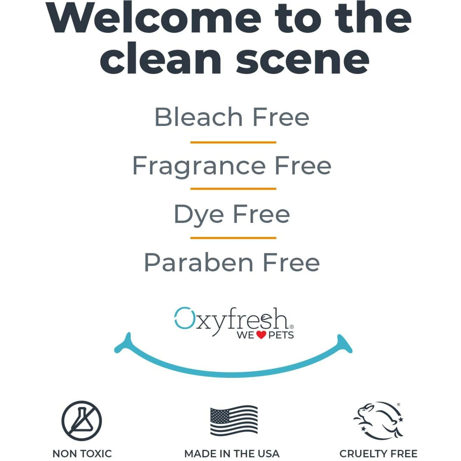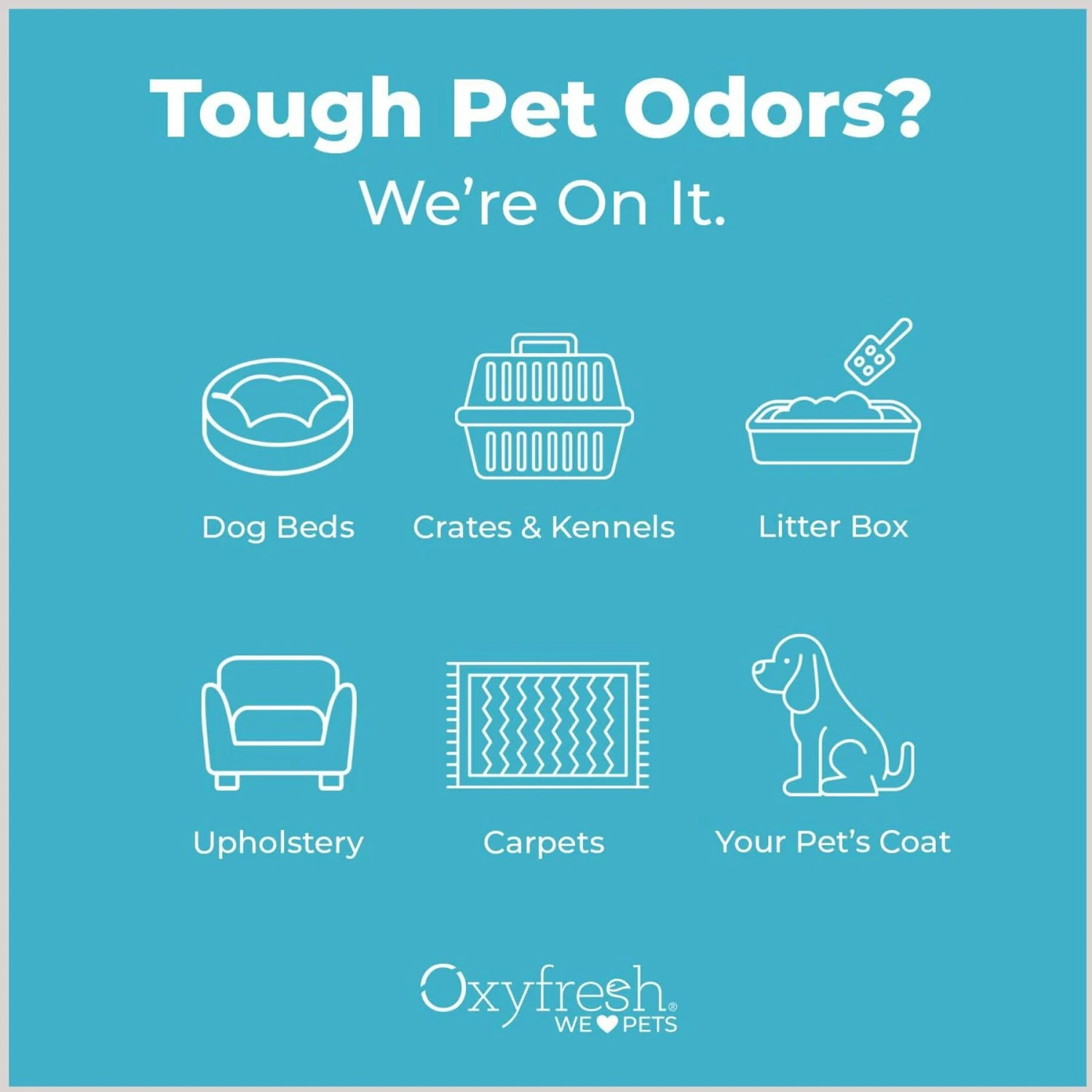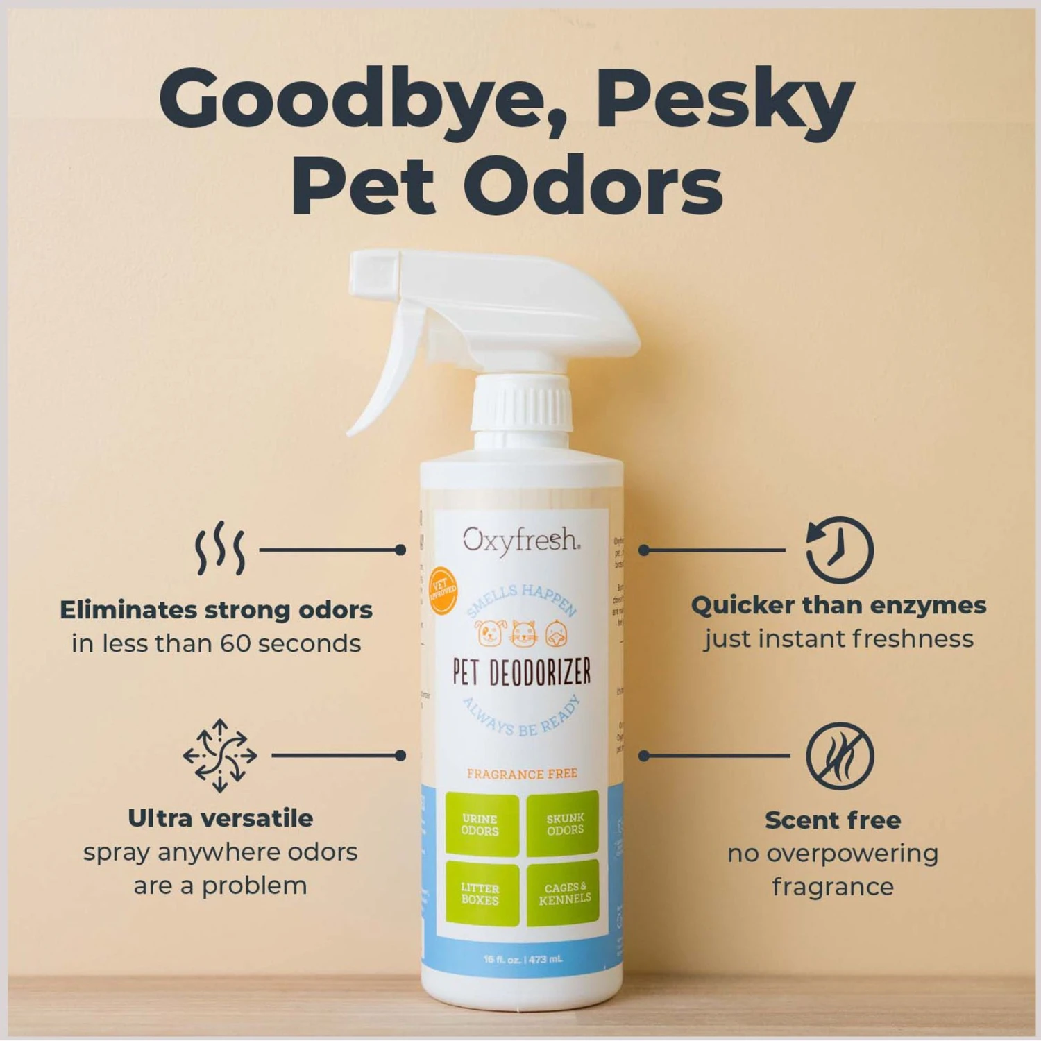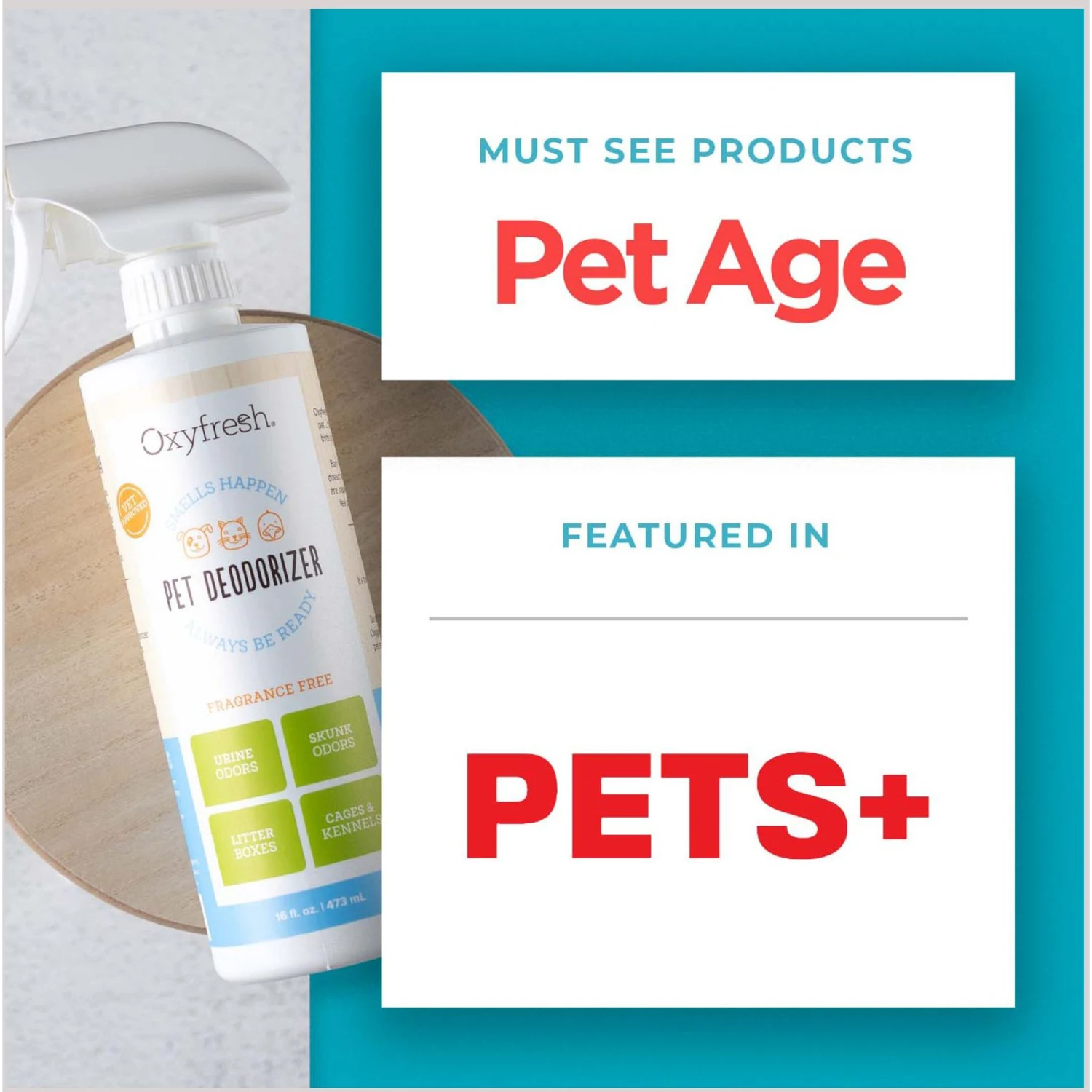 Send stinky smells on their way with Oxyfresh All Purpose Dog & Cat Deodorizer. This pet deodorizer features the exclusive Oxygene oxidizing formula that breaks down organic odor-causing compounds–leaving absolutely no scent behind. Urine, feces, vomit and even skunk, all these nasty odors are neutralized with Oxygene and the gentle process of oxidation. Plus, it has no scents, parabens, alcohol, dyes, or toxic chemicals. Best of all, smells will be gone in just 60 seconds! Since this spray is non-toxic, you can safely use it anywhere in your home, even directly on your pet! Just spray and walk away–no residue is left behind and there’s no need to rinse or blot. It’s a great choice for your dog, cat, bird, or critter. Paw-fect for dog bedding, clothing, litter boxes, kennels, and bird or animal cages. Deodorizer is dye-free and safe for all surfaces, but check for color fastness on delicate materials.