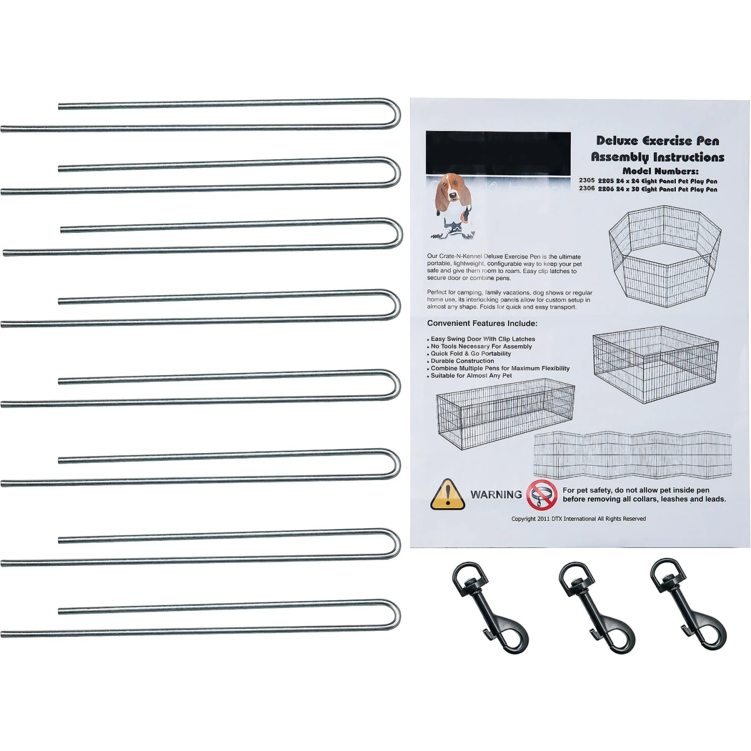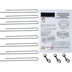 - Includes eight ground stakes for outdoor use and three locking hooks to connect the two ends of the fencing.