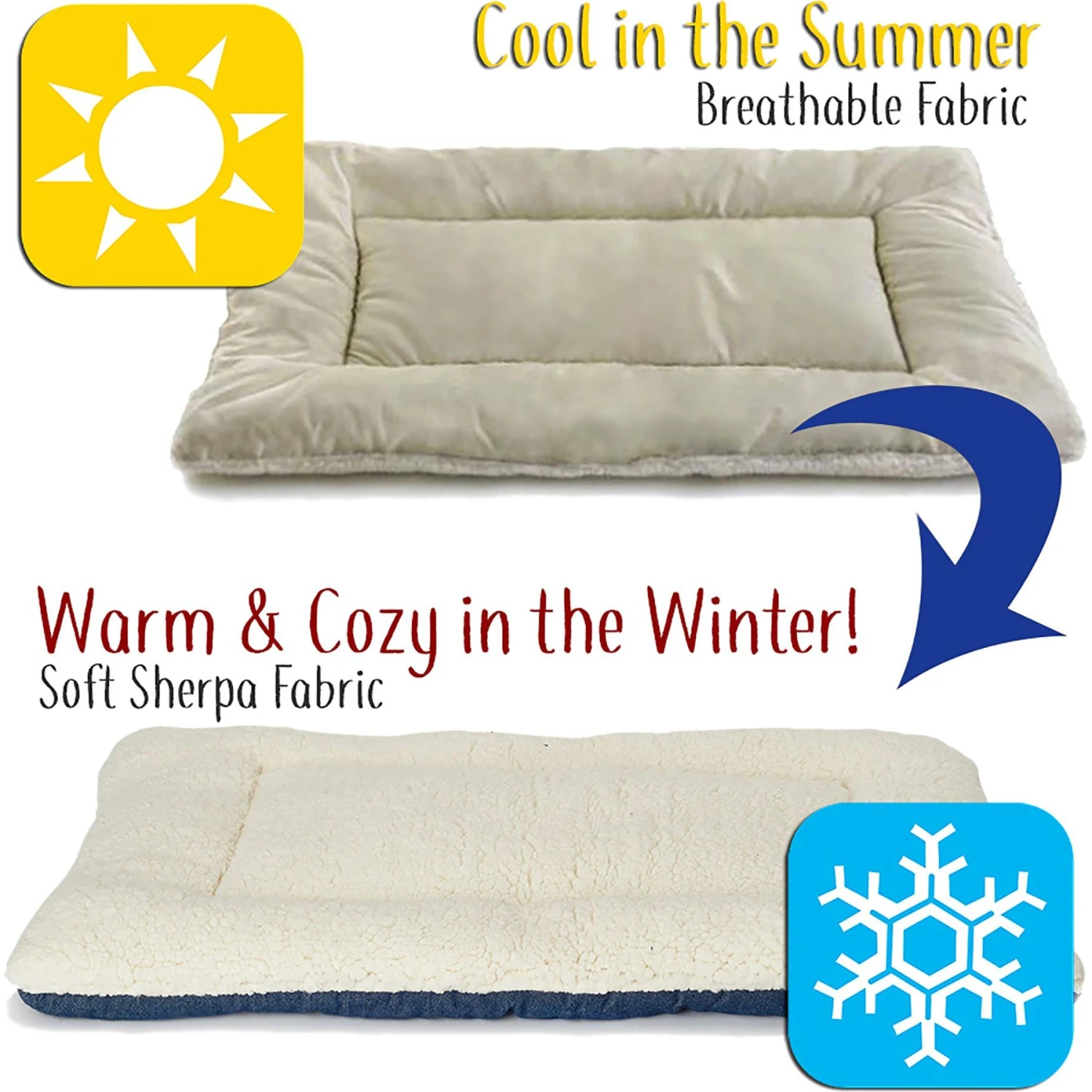 Pet Dreams Sleep-eez Classic Reversible Dog Crate Mat is a 2-in-1 bed that’s paw-fect for every season! This reversible mat features a cool cotton size that’s paw-fect for summer and a Sherpa side that’s grrr-eat for winter. It’s made to be used wherever your canine companion likes to sleep, like in her crate, on the couch, in the car or her other favorite spots. And for your convenience, the entire bed can go in the washer and dryer and you won’t have to deal with the hassle of zippers or covers! Designed for repeated washings, this mat won’t bunch up after washing like other beds will. Choose your favorite color and the best size for your pet and watch her lay in luxury!