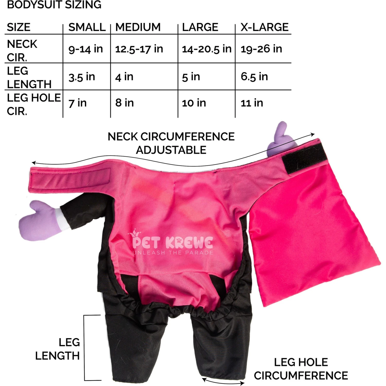- An adjustable fuzzy fastener on the bodysuit helps keep your pal comfy.