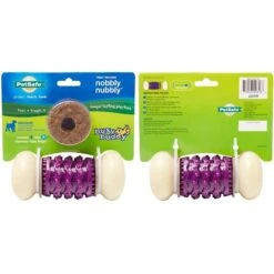 With the Busy Buddy Nobbly Nubbly Treat Dispenser Tough Dog Chew Toy your dog will get to enjoy playtime and treat time at the same time! This exciting toy holds two kinds of tasty treats—slide rawhide treat rings on either end of the toy, spread peanut butter or doggie toothpaste on the middle grooves, or add both. The nylon ridges help keep your canine companion’s teeth clean and the durable rawhide chew stand up to tough chewers!