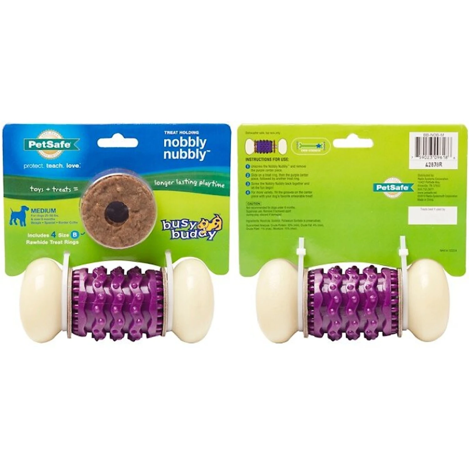 - You can add Busy Buddy rawhide treat rings on either end or spread peanut butter on the middle grooves!