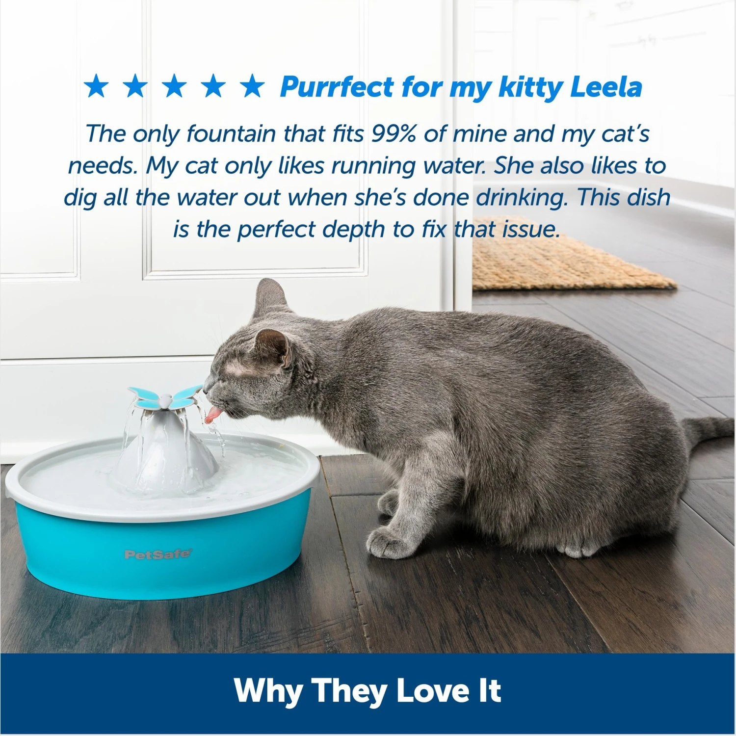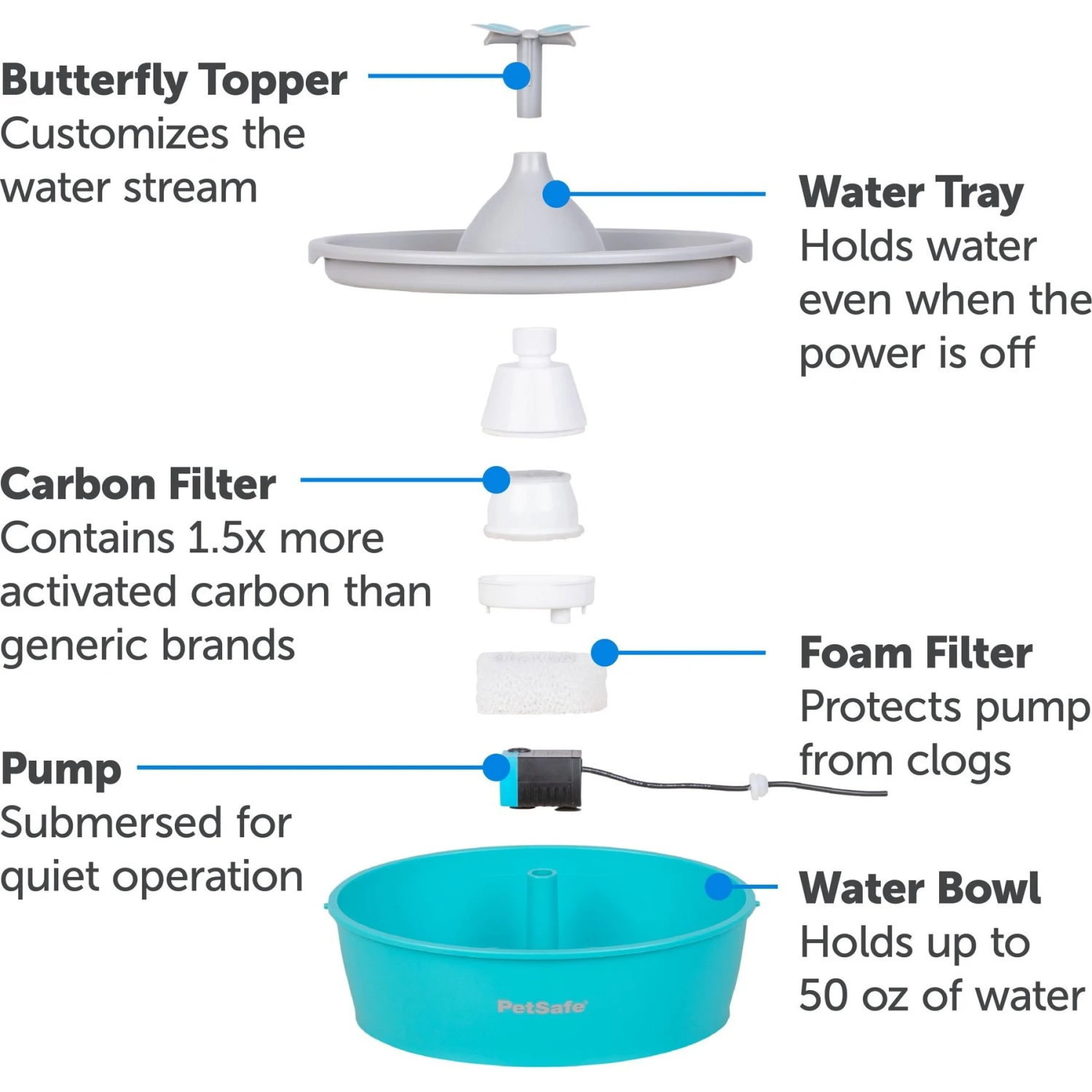 - Super quiet fountain promotes healthy hydration with 50-oz of water and constant water flow that won’t overheat.