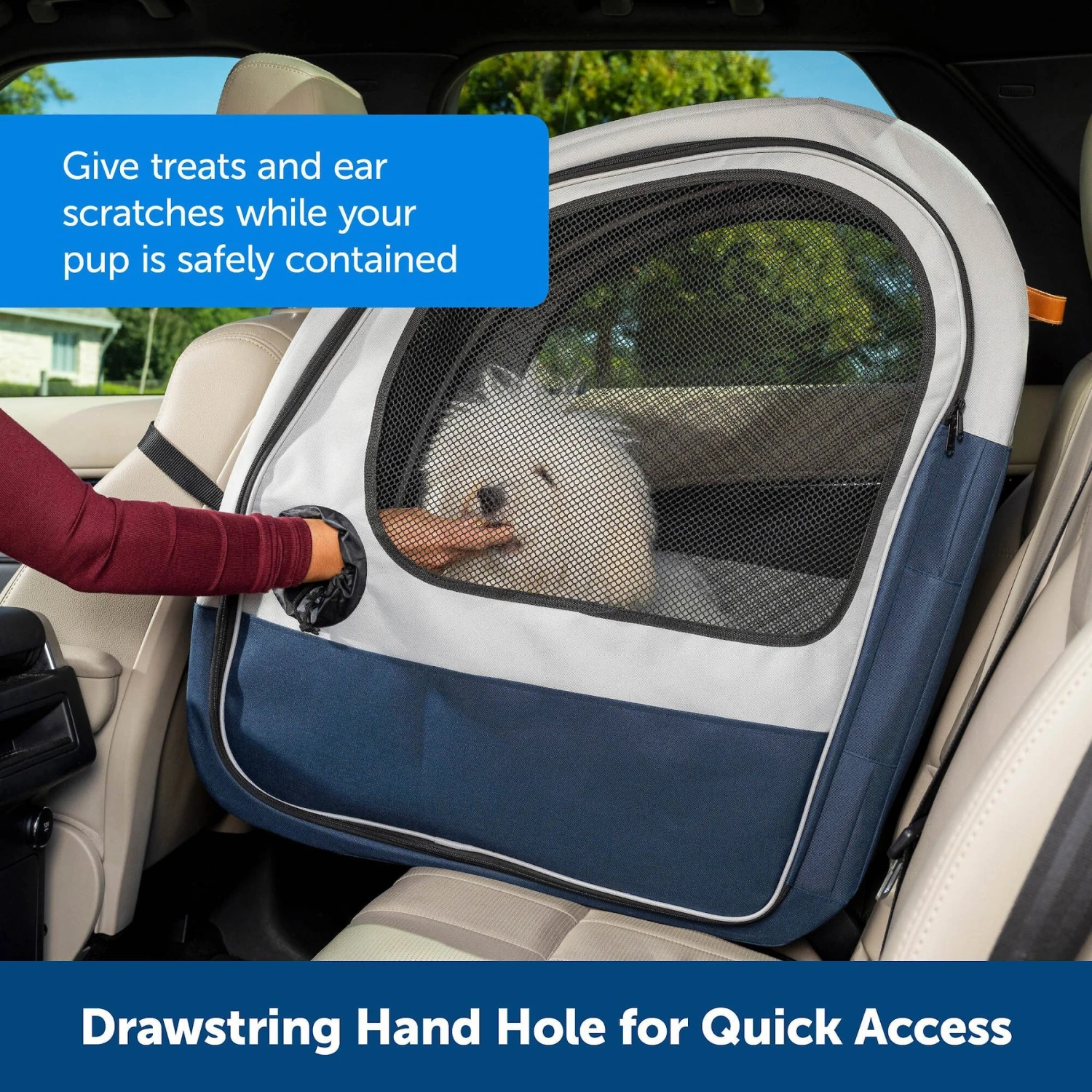 Your best bud will be psyched to travel in PetSafe’s Happy Ride Collapsible Cat & Dog Travel Crate! This roomy, portable, aluminum frame crate is designed to feel spacious without taking up the entire backseat—it only fills one spot—so you’ll have room for another passenger. The large, mesh front and sides let your paw-tner see everyone inside the car and allow air to flow, keeping her temperature just right. Plus it gives her the option to look out the car window and lets you peek in to check on her. No need to worry about travel accidents—the cozy pad inside the crate has a removable, waterproof, machine washable fleece cover and the crate’s collapsible outer shell is also machine washable. The crate is designed with slits for seatbelts so it stays securely in place once you install it. Its two doors fully unzip, letting you get your pet into and out of the car with ease. Plus, it has two drawstring openings for easy access even when the doors are zipped. The two storage pockets are great spaces to keep your BFF’s things and the whole crate folds down easily for convenient storage when not in use.