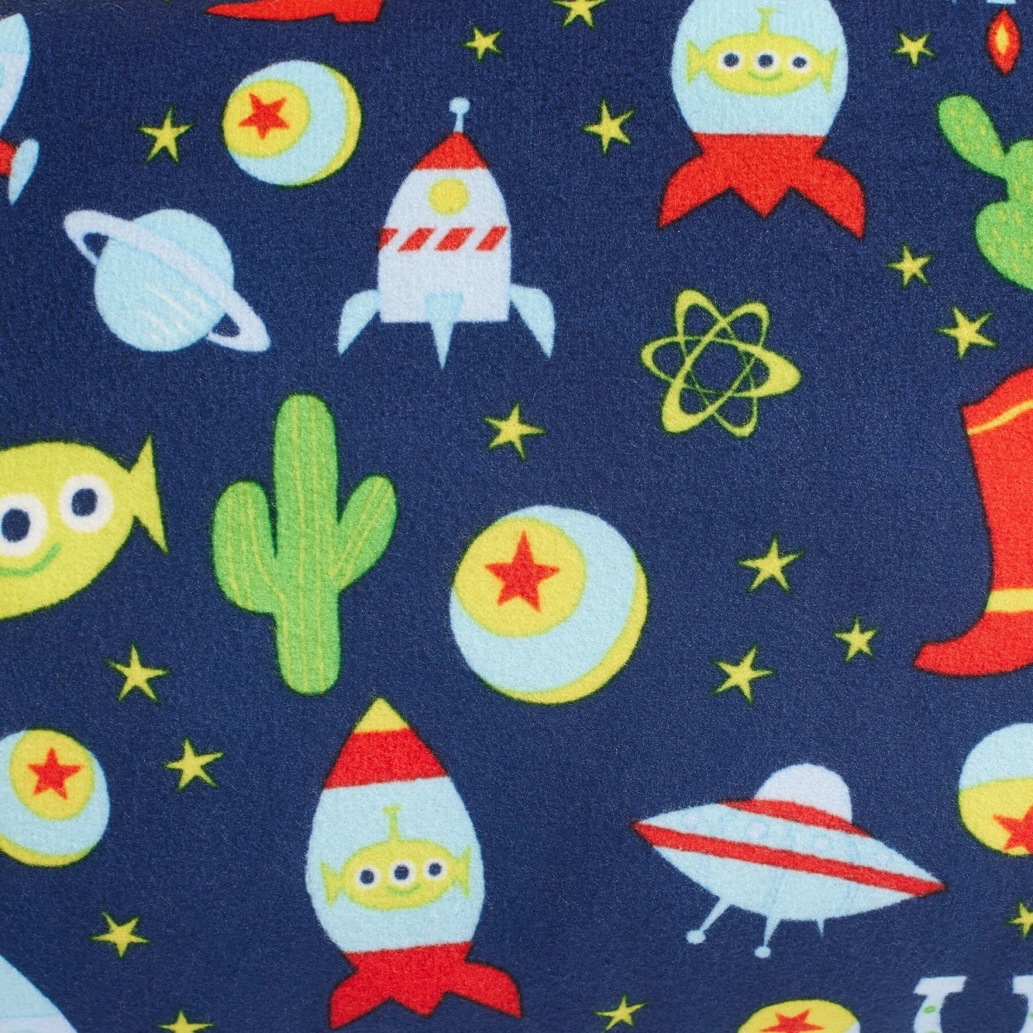 - Sherpa fleece inside with a cute Toy Story-themed print, featuring Pizza Planet aliens, rocket ships, cacti, Woody’s boot and more, around the outside.