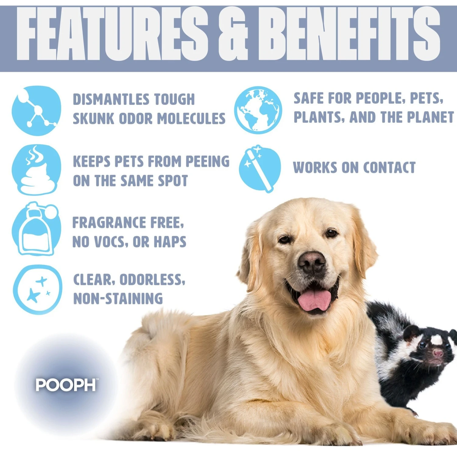 Be prepared for the worst with POOPH Skunk Odor Eliminator! This special formulation is designed to break down the molecular structure of a skunk’s stink, so you’ll never have to worry about getting skunked again. Plus, it’s fragrance-free, non-sensitizing and won’t leave any stains. Keep your pet, your home and the planet safe with this odor eliminator. Don’t be without it when you need it most—keep a bottle (or more if you have multiple pets) handy.