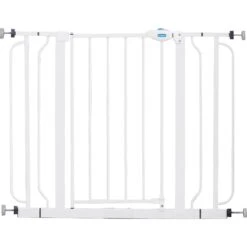 Keep precious pet safe and contained with the Regalo Wall Safe Extra Wide Dog Gate with Wall Shields. Sturdy and stylish, this convenient 30 inch tall safety gate adjusts to accommodate openings between 29 and 41.5 inches. The easy slide latch locks the gate automatically when it’s pushed closed, while the convenient walk-through design lets you pass through easily. Plus, it comes with wall shields to help keep your walls blemish free. Designed to be sleek and secure, Regalo Wall Safe Dog Gate will help keep your paw-tner and your walls safe.