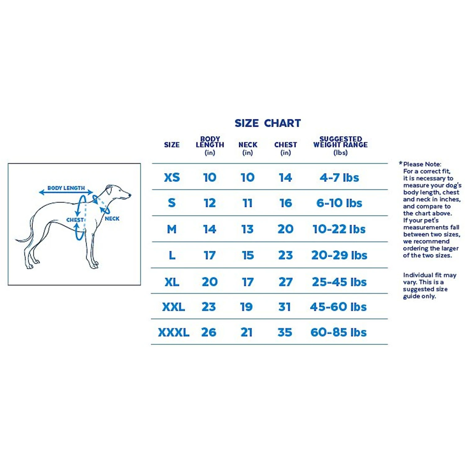 Intended to be used for short duration, under close supervision. Always supervise pet to ensure they do not destroy or ingest product. May contain small parts. Not suitable for children. Inspect regularly and replace if any part becomes damaged. For the perfect fit, measure your pet carefully when selecting a size from the Size tab. Sizing recommendations per breed are only guesstimates, since no two dogs are exactly alike.
