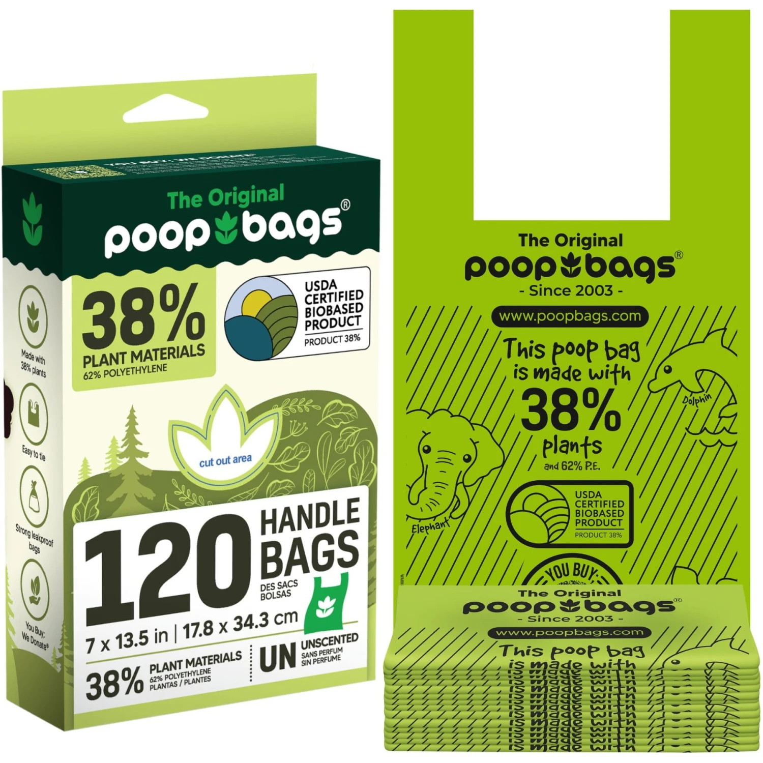 Keep your walks with your best pal relaxed and worry free with The Original Poop Bags Handle Tie Biobased Waste Bags. These silky smooth bags feature 38% biobased content and are leak-proof and extra thick–so you can bark bye-bye to messy accidents and embarrassing spills. Plus, the handle tie feature lets you pick up and dispose of stinking waste in seconds. A convenient, responsible choice for waste removal.