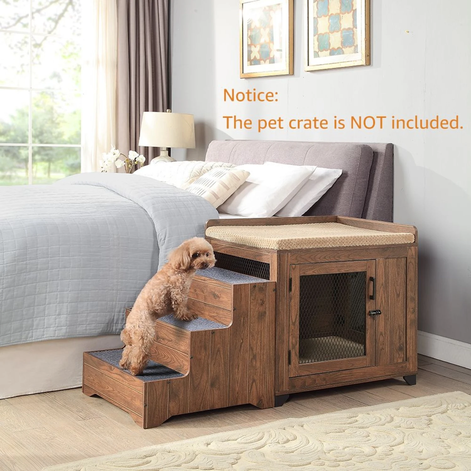 Your furbaby has important places to be—help him get there comfortably with the Unipaws Wooden Three-Story Dog Ladder! With a weight capacity of 125 pounds, these durable stairs can help your pal reach their favorite places fast. The thoughtful design helps reduce the physical impact of jumping, so it’s paw-fect for small, elderly, injured or arthritic pets. A wooden exterior easily complements most home decor. Plus, the steps feature a soft carpet that helps your friend get a good, confident grip.